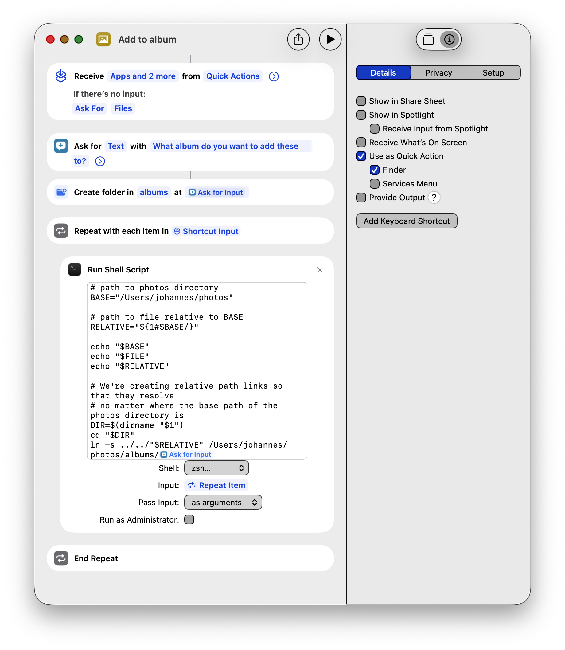 The upside/downside of this is that it forces me to sort photos into albums. To make it easier, I created a shortcut for this, which I wanted to share with others who might want to escape Photos. Tough luck though, Apple requires iCloud login just to share a local automation script, so here's a screenshot. It's so frustrating.